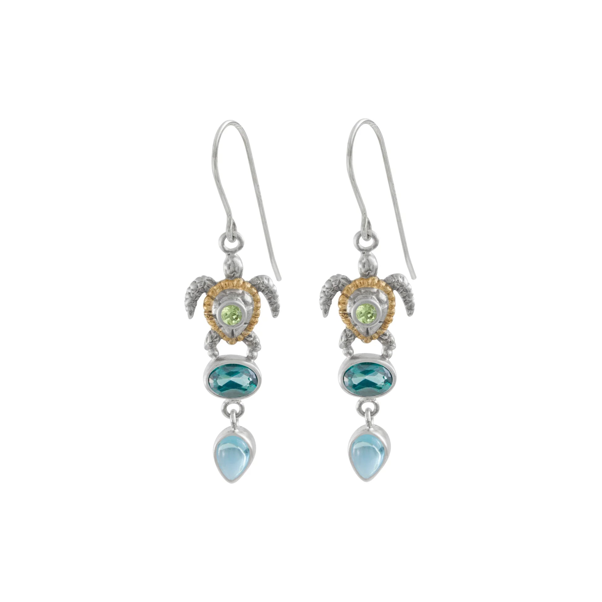 Gorgeous Sea Turtle Sterling Silver Earrings set Gemstones: Blue Topaz, Green Topaz & Peridot.