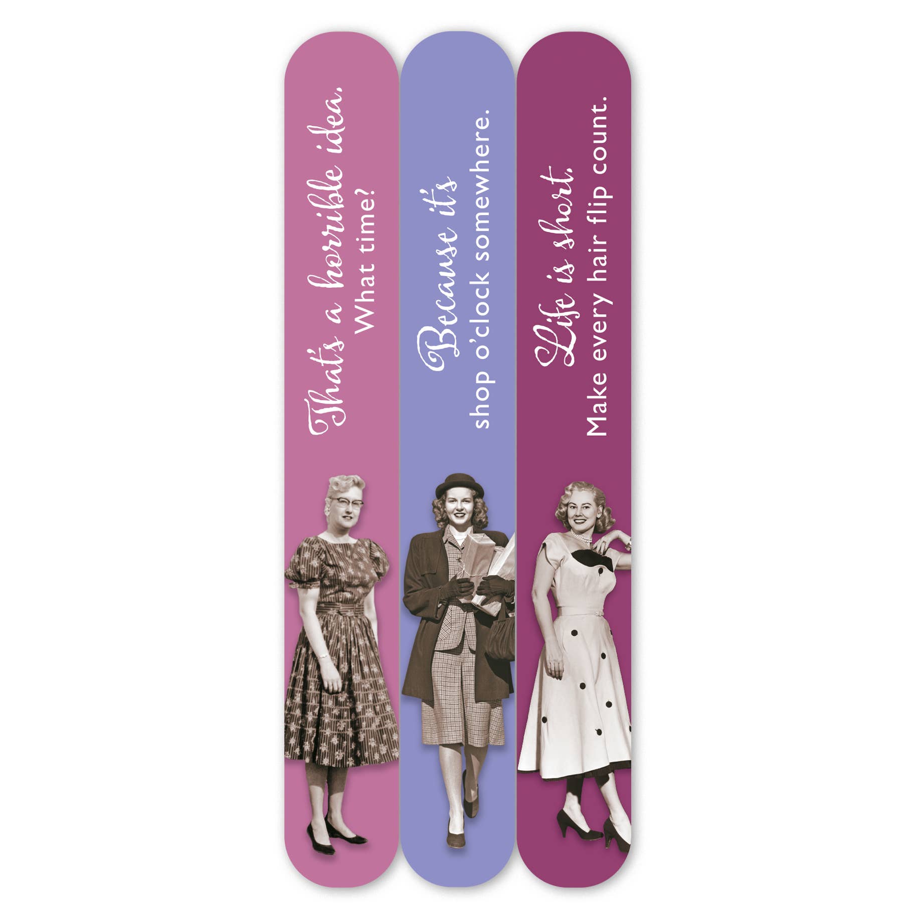 Sturdy and double-sided, makes manicures and touch-ups easy! One colorful side features a vintage photo and sassy saying, with pretty patterns on the back. Each set contains three styles, all in one handy dandy vinyl case. File these under fabulous! Emery board size: 13/16" x 5 7/8" Package size: 3 7/8" x 6"