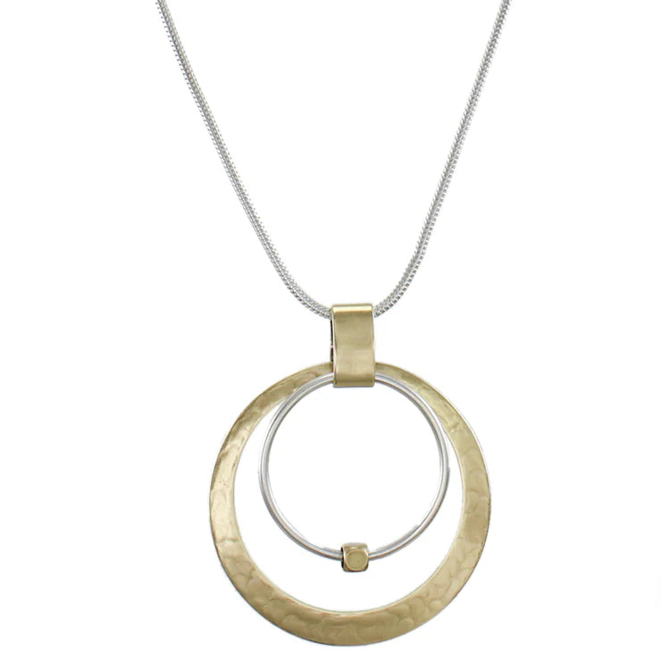 A brass cutout disc layered with a smooth silver ring with a small cube bead all on a long round snake chain.