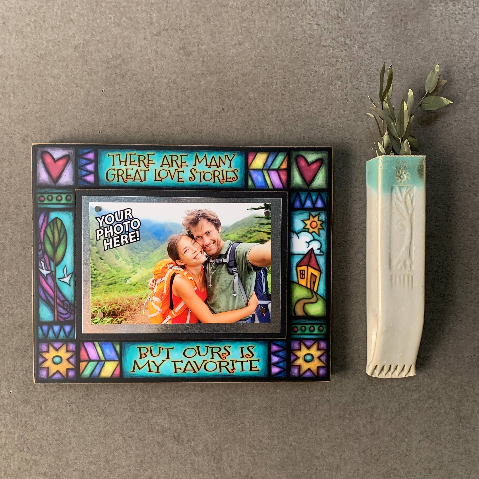 Frame featuring the art of Michael Macone with quote, "There are many great love stories, but ours is my favorite". This 8"x 10" wood frame holds a 4" x 6" photograph on a sheet metal square with four super-strong rare earth magnets. It is printed with archival ink on archival paper which is attached to wood and UV coated to last a lifetime. Frame can hang or stand with included peg.